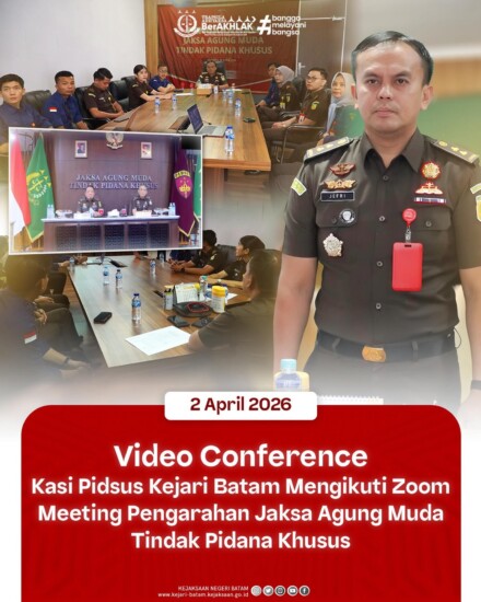 Kamis, 02 April 2026 Bertempat di Ruang Video Conference Lantai IV Kantor Kejaksaan Negeri Batam, Kepala Seksi Tindak Pidana Khusus, Jefri Hardi, S.H., M.H., bersama jajaran Staf Tindak Pidana Khusus mengikuti kegiatan Zoom Meeting pengarahan Jaksa Agung Muda Tindak Pidana Khusus. Pengarahan tersebut disampaikan oleh Jaksa Agung Muda Tindak PidanaSelanjutnya…