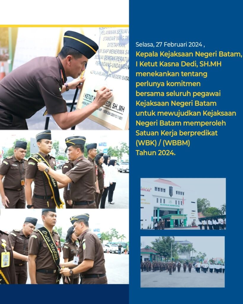 Kepala Kejaksaan Negeri Batam, I Ketut Kasna Dedi, S.H.,M.H. bertindak sebagai Pembina Apel menekankan perlunya komitmen bersama seluruh pegawai Kejaksaan Negeri Batam untuk mewujudkan Kejaksaan Negeri Batam memperoleh Satuan Kerja berpredikat WBK/WBBM tahun 2024 ini.