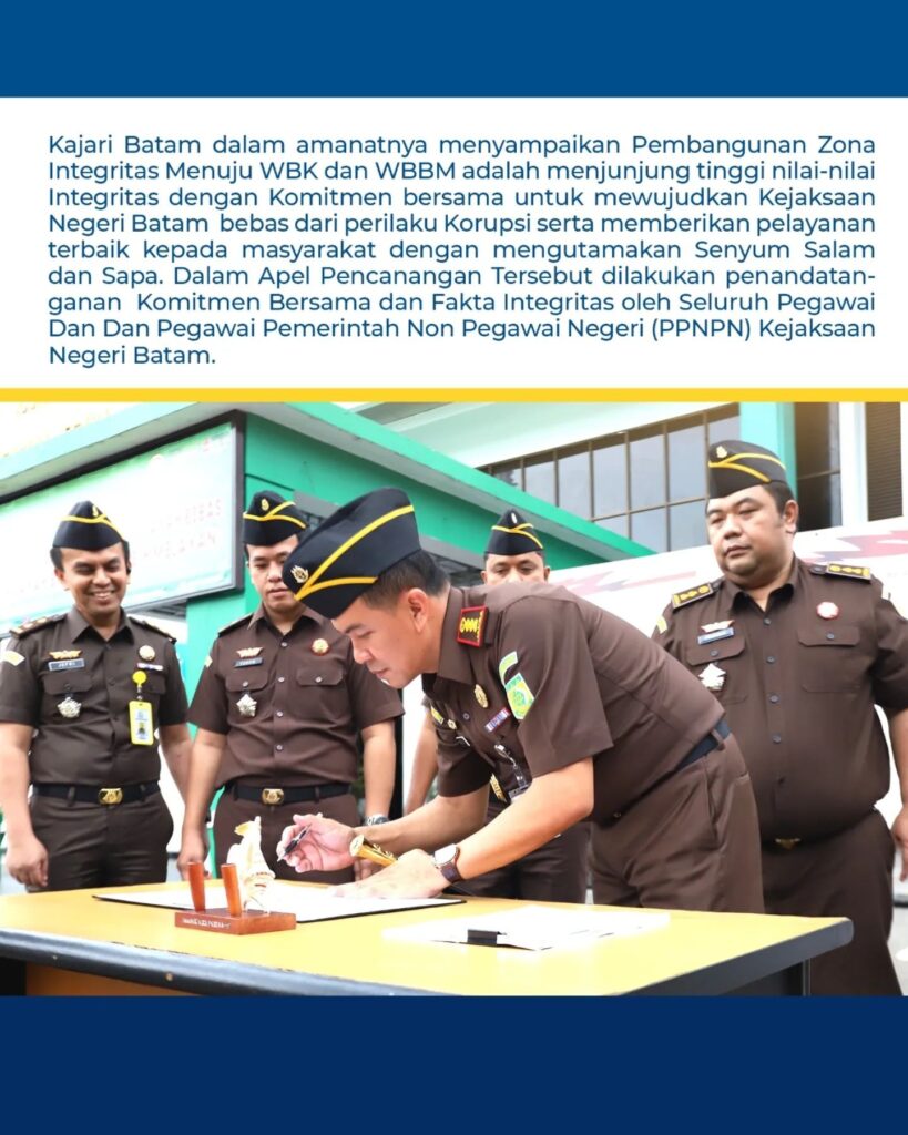 Kejaksaan Negeri Batam yg mengusung tagline BISA Berintegritas, Inovatif, Santun, Amanah telah berkomitmen mewujudkan Zona Integritas tersebut ditandai dengan penandatanganan Komitmen Bersama dan Fakta Inegritas oleh Kepala Kejaksaan Negeri Batam dan seluruh Pegawai Kejaksaan Negeri Batam.