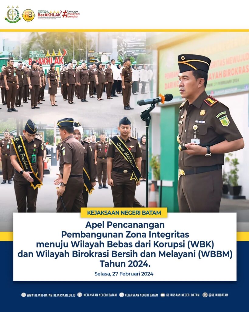 Kejaksaan Negeri Batam melaksanakan Apel Pembangunan Zona Integritas menuju Wilayah Bebas dari Korupsi (WBK) dan Wilayah Birokrasi Bersih dan Melayani (WBBM) Tahun 2024.