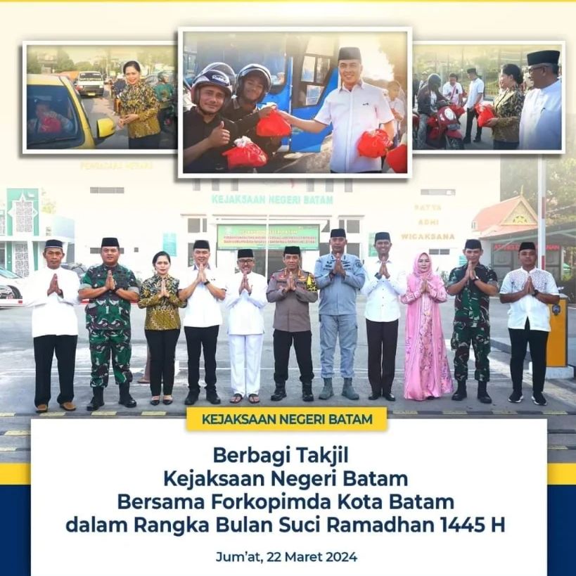 Dalam rangka Bulan Suci Ramadhan 1445 H Kejaksaan Negeri Batam dan Ikatan Adhyaksa Dharmakarini Daerah Batam bersama Forkopimda Kota Batam melaksanakan kegiatan Berbagi Takjil Kepada Masyarakat di depan kantor Kejaksaan Negeri Batam.