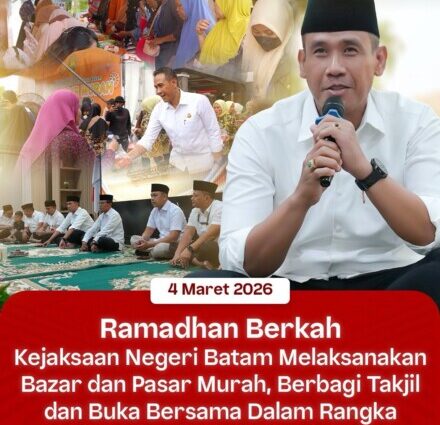 Bertempat di Kantor Kejaksaan Negeri Batam, Kepala Kejaksaan Negeri Batam I Wayan Wiradarma, S.H., M.H., didampingi oleh Ketua Ikatan Adhyaksa Dharmakarini (IAD) Daerah Batam Ny. Evayani Wiradarma, bersama Para Kasi, Kasubagbin dan seluruh pegawai Kejaksaan Negeri Batam melaksanakan kegiatan Bazar dan Pasar Murah, Berbagi Takjil, serta Buka Puasa Bersama dalam rangka menyemarakkan Bulan Suci Ramadhan 1447 H.