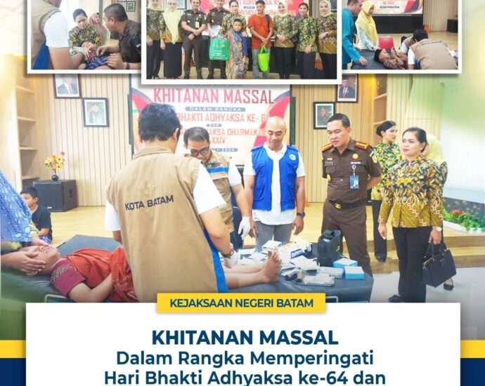 Kamis, 18 Juli 2024 Bertempat di Aula Lt.3 Kantor Kejari Batam, Kepala Kejaksaan Negeri Batam I KETUT KASNA DEDI, S.H., M.H. beserta Para Kasi dan Ketua IAD Daerah Batam Ny. EKA KASNA beserta Pengurus melaksanakan Khitanan Massal Dalam Rangka Memperingati Hari Bhakti Adhyaksa ke-64 dan HUT XXIV Ikatan Adhyaksa Dharmakarini.Selanjutnya…